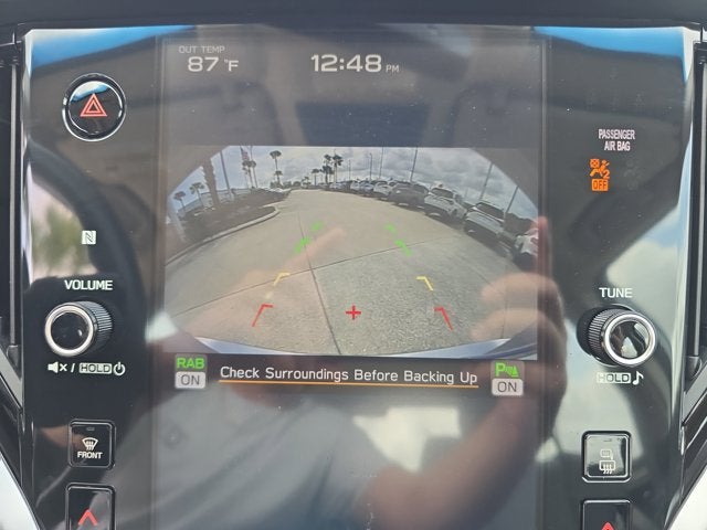 Equipped with 12 Speakers, 4-Wheel Disc Brakes, ABS brakes, Air Conditioning, Alloy wheels, AM/FM radio: SiriusXM, Anti-whiplash front head restraints, Auto High-beam Headlights, Auto-dimming Rear-View mirror, Automatic temperature control, Brake assist, Bumpers: body-color, Compass, Driver door bin, Driver vanity mirror, Dual front impact airbags, Dual front side impact airbags, Electronic Stability Control, Emergency communication system, Exterior Parking Camera Rear, Four wheel independent suspension, Front anti-roll bar, Front Bucket Seats, Front Center Armrest w/Storage, Front dual zone A/C, Front fog lights, Front reading lights, Fully automatic headlights, Garage door transmitter: HomeLink, harman/kardon® Speakers, Heated door mirrors, Heated Front Bucket Seats, Heated front seats, Heated rear seats, Illuminated entry, Knee airbag, Leather Shift Knob, Leather steering wheel, Low tire pressure warning, Memory seat, Occupant sensing airbag, Outside temperature display, Overhead airbag, Overhead console, Panic alarm, Passenger door bin, Passenger vanity mirror, Perforated Leather-Trimmed Upholstery, Power door mirrors, Power driver seat, Power passenger seat, Power steering, Power windows, Radio: Subaru STARLINK 11.6 Multimedia Plus Sys, Rear anti-roll bar, Rear seat center armrest, Rear window defroster, Remote keyless entry, Security system, Speed control, Speed-sensing steering, Split folding rear seat, STARLINK/Apple CarPlay/Android Auto, Steering wheel mounted audio controls, Tachometer, Telescoping steering wheel, Tilt steering wheel, Traction control, Trip computer, Turn signal indicator mirrors, Variably intermittent wipers, and Wheels: 18 x 7.5J Aluminum-Alloy Black.