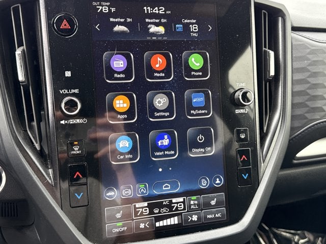 Equipped with Power Rear Gate & Blind Spot Detection w/RCTA (Automatic Emergency Steering, Blind-Spot Detection (BSD)/RCTA System, and Power Rear Gate), 4-Wheel Disc Brakes, 6 Speakers, ABS brakes, Air Conditioning, All-Weather Floor Liners, Alloy wheels, AM/FM radio: SiriusXM with 360L, Anti-whiplash front head restraints, Auto High-beam Headlights, Automatic temperature control, Brake assist, Bumpers: body-color, Cargo Tray, Driver door bin, Driver vanity mirror, Dual front impact airbags, Dual front side impact airbags, Electronic Stability Control, Emergency communication system: MySubaru Safety (3-year free trial), Exterior Parking Camera Rear, Four wheel independent suspension, Front anti-roll bar, Front Bucket Seats, Front Center Armrest, Front dual zone A/C, Front fog lights, Front reading lights, Fully automatic headlights, Heated door mirrors, Heated Front Bucket Seats, Heated front seats, Illuminated entry, Knee airbag, Leather steering wheel, Low tire pressure warning, Occupant sensing airbag, Outside temperature display, Overhead airbag, Overhead console, Panic alarm, Passenger door bin, Passenger vanity mirror, Power door mirrors, Power driver seat, Power moonroof: Panoramic, Power steering, Power windows, Premium Textured Cloth Upholstery, Radio data system, Radio: Subaru 11.6 Multimedia Plus System, Rear anti-roll bar, Rear Bumper Cover, Rear seat center armrest, Rear Seatback Protector, Rear window defroster, Rear window wiper, Remote keyless entry, Security system, Speed control, Speed-sensing steering, Splash Guards, Split folding rear seat, Spoiler, Steering wheel mounted audio controls, Tachometer, Telescoping steering wheel, Tilt steering wheel, Traction control, Trip computer, Variably intermittent wipers, and Wheels: 17 x 7.0 J Dark Metallic Aluminum-Alloy.