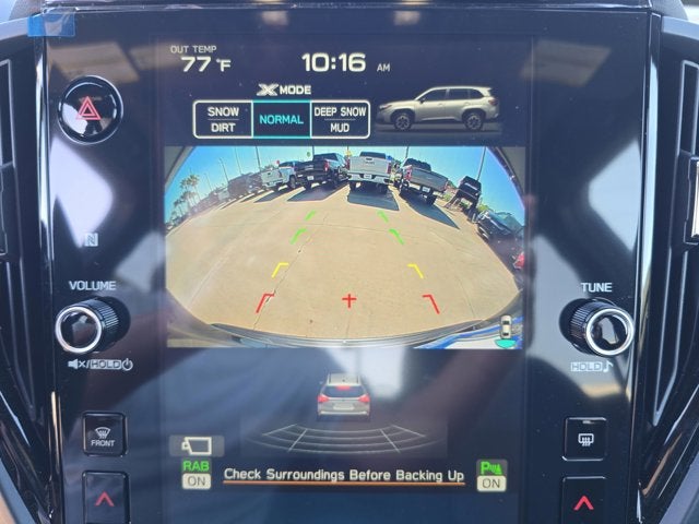 Equipped with Standard Model, Touring Package (All-Weather Floor Liners, Auto-Dimming Exterior Mirror with Approach Light, Body Side Molding - Crystal White Pearl, LED Upgrade, Rear Bumper Cover, and Splash Guards), 11 Speakers, 4-Wheel Disc Brakes, ABS brakes, Air Conditioning, Alloy wheels, AM/FM radio: SiriusXM with 360L, Anti-whiplash front head restraints, Auto High-beam Headlights, Automatic temperature control, Brake assist, Bumpers: body-color, Cargo Sidewall Protector, Compass, Driver door bin, Driver vanity mirror, Dual front impact airbags, Dual front side impact airbags, Electronic Stability Control, Emergency communication system: MySubaru Safety (3-year free trial), Exterior Parking Camera Rear, Four wheel independent suspension, Front anti-roll bar, Front Bucket Seats, Front Center Armrest, Front dual zone A/C, Front fog lights, Front reading lights, Fully automatic headlights, harman/kardon® Speakers, Heated and Ventilated Front Bucket Seats, Heated door mirrors, Heated front seats, Heated rear seats, Heated steering wheel, HVAC memory, Illuminated entry, Knee airbag, Low tire pressure warning, Memory seat, Navigation system: TomTom Navigation w/what3words, Occupant sensing airbag, Outside temperature display, Overhead airbag, Overhead console, Panic alarm, Passenger door bin, Passenger vanity mirror, Perforated Leather-Trimmed Upholstery, Power door mirrors, Power driver seat, Power Liftgate, Power moonroof: Panoramic, Power passenger seat, Power steering, Power windows, Radio data system, Radio: Subaru 11.6 Multimedia Navigation System, Rear anti-roll bar, Rear seat center armrest, Rear Seatback Protector, Rear window defroster, Rear window wiper, Remote keyless entry, Security system, Speed control, Speed-sensing steering, Split folding rear seat, Spoiler, Steering wheel mounted audio controls, Tachometer, Telescoping steering wheel, Tilt steering wheel, Traction control, Trip computer, Turn signal indicator mirrors, Variably intermittent wipers, Ventilated front seats, and Wheels: 19 x 7.5 J Dark Gray Aluminum-Alloy.